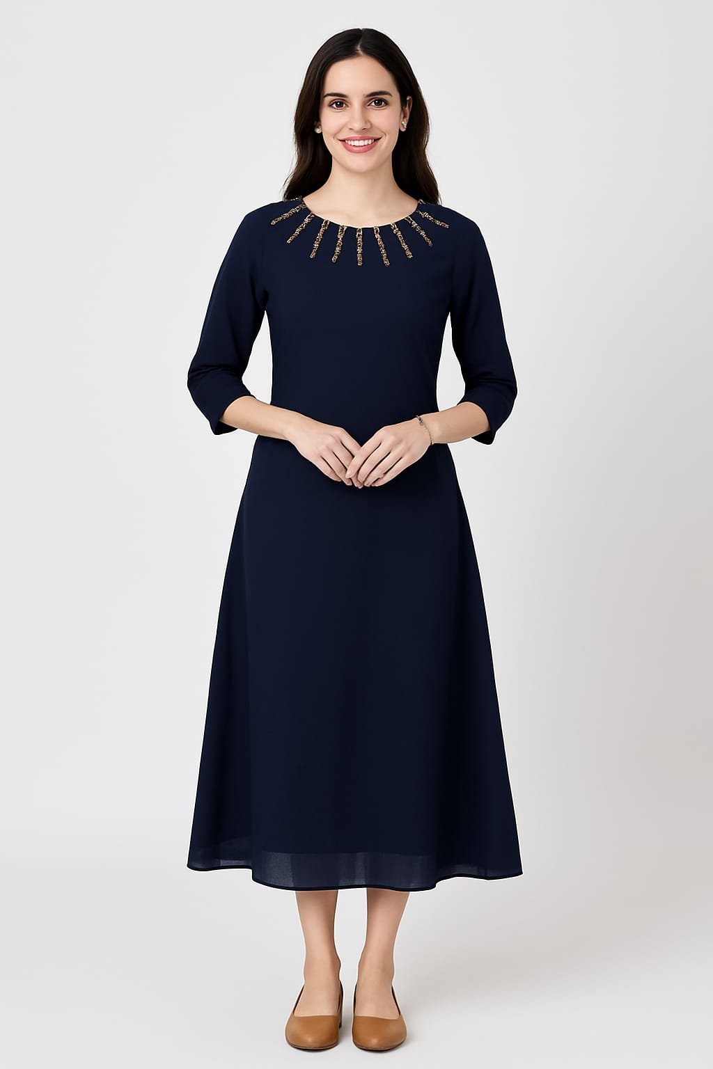 This kurti features a timeless A-line cut with 3/4th sleeves for a balanced and graceful appearance. The subtle golden embellishments on the neckline serve as an understated accent, enhancing the overall aesthetic without overpowering the design. These elegant details make the kurti versatile enough for festive occasions, while its simple silhouette ensures it’s equally appropriate for refined everyday wear.